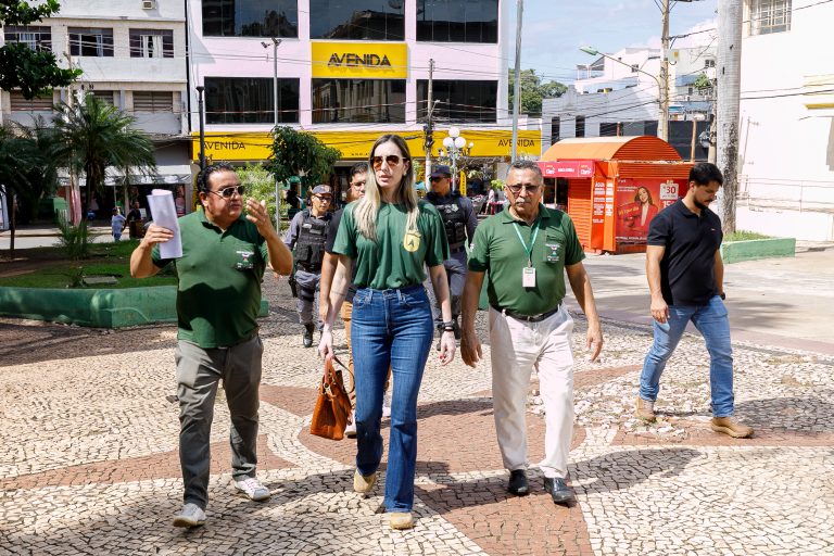 A foto mostra os fiscais da Secretaria de Ordem Pública e a secretária, Juliana Chiquito Palhares durante a ação para notificação dos comerciantes ambulantes na região central.